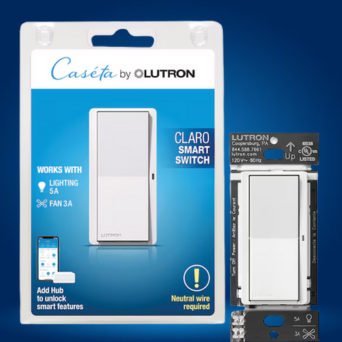 The Claro Caseta switch has the appearance of a standard Decora-style switch, making it blend seamlessly with other devices. Its app-controlled status LED gives you the flexibility to choose how it functions — including the option to keep it always on, making the switch easy to locate in the dark.